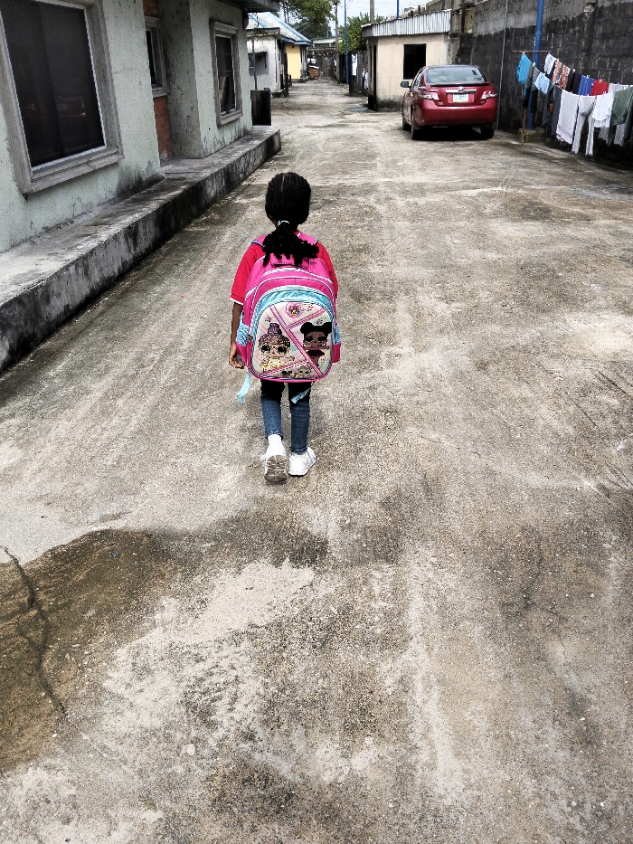 The image displays a young child, viewed from behind, walking down a concrete alleyway or pathway in Port-Harcourt, Nigeria