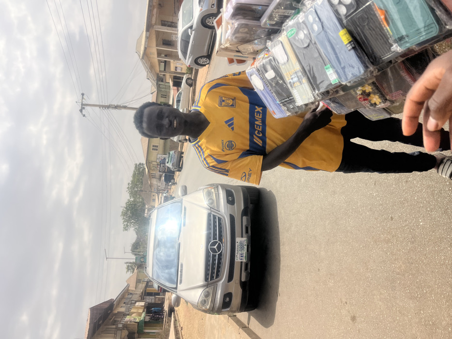 The image depicts an outdoor street scene in Jos, Plateau State, Nigeria, under an overcast or hazy sky. In the immediate foreground, a young adult Black male, identified as a street vendor, stands smiling faintly while facing the camera. He wears a yellow and blue short-sleeved football jersey with "TIGRES" and "CEMEX" branding, black trousers, and white-and-black striped slide sandals. He holds a display stand loaded with numerous individually packaged smartphone cases of various colors and designs, extending it towards the viewer. A light-skinned hand is partially visible in the bottom right, positioned near the phone cases, suggesting interaction with the merchandise. To the vendor's left, a light gold Mercedes-Benz ML-Class SUV is parked on the asphalt road. Its front license plate displays "PLATEAU" and "KWK 988RL." Significant sun glare is reflected on the SUV's windshield. The paved road recedes into the background, flanked by buildings of varying heights and architectural styles, including multi-story structures with balconies. Overhead utility lines and power poles are prominent along the street. Additional vehicles, including a silver SUV, are visible further down the road on the right. Sparse greenery is present between some of the buildings.