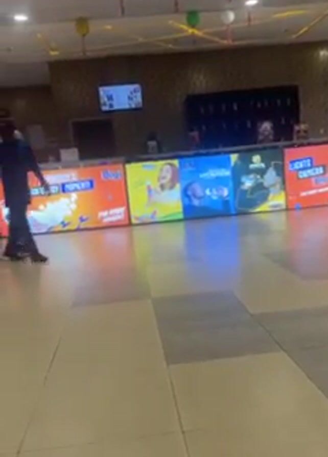 lobby of a movie theater. A woman in a striped shirt and jeans is standing, looking at the camera. People walk by in the background, past a concession stand decorated with colorful advertisements. There are balloons hanging from the ceiling. Someone walks by, drinking from a bottle.
