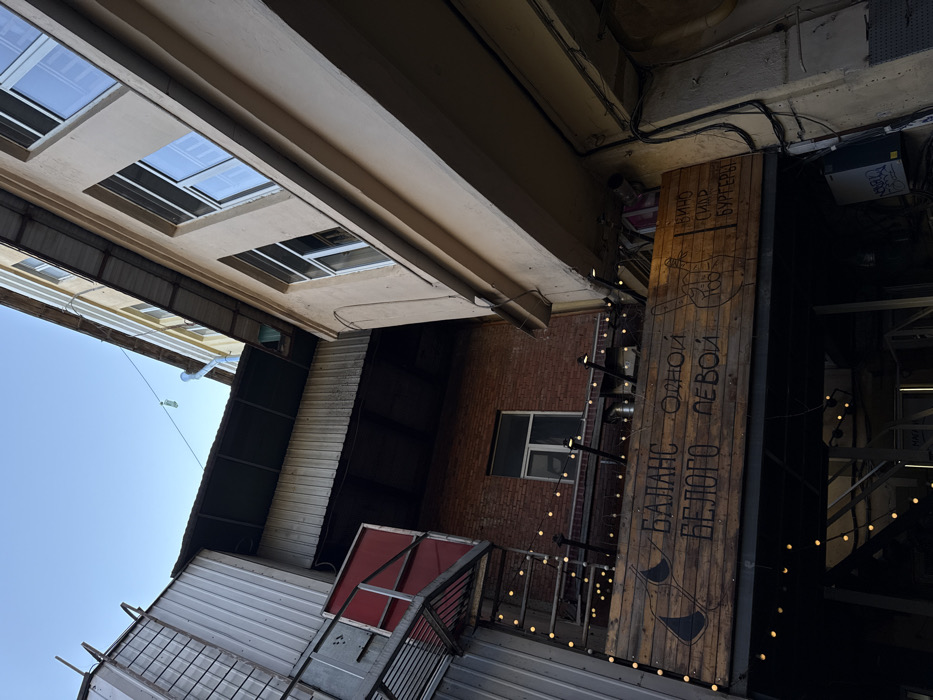 The image captures a view looking upwards into a narrow urban passage or courtyard located at Konnaya Ulitsa, 1/3, Saint Petersburg, Russia. On the right, a multi-story building with a light beige stucco facade features several white-framed windows reflecting a clear blue sky. On the left, an adjacent structure presents an industrial aesthetic, clad in vertical corrugated metal panels, with a red rectangular element positioned at an upper level. In the background, a brick wall with a single white-framed window is visible beneath dark corrugated roofing. A prominent feature is a suspended wooden structure, acting as an upper-level platform or sign, adorned with numerous warm-toned string lights and multiple upward-facing spotlights. This wooden surface bears black Cyrillic text: "БАЛАНС ОДНОЙ БЕЛОГО ЛЕВОЙ" (Balance One White Left) and "ВИНО СИДР БУРГЕРЫ" (Wine Cider Burgers), accompanied by painted hand gestures including a stylized "ok" and a peace sign. Electrical conduits are visible along the right-hand building's facade. High above the structures, a translucent green plastic bottle is suspended by a thin wire. No individuals or direct interactions are depicted within the scene.
