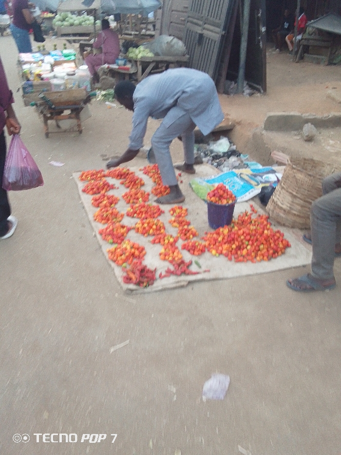 A street vendor in gray bends over a blanket spread with clusters of small, round, red and orange peppers for sale. A bucket filled with peppers sits nearby. Other vendors and shoppers are visible in the background, amidst various wares and stalls. The ground is rough and littered. Part of another person carrying a purple bag is visible to the left and a person in gray sits to the right.