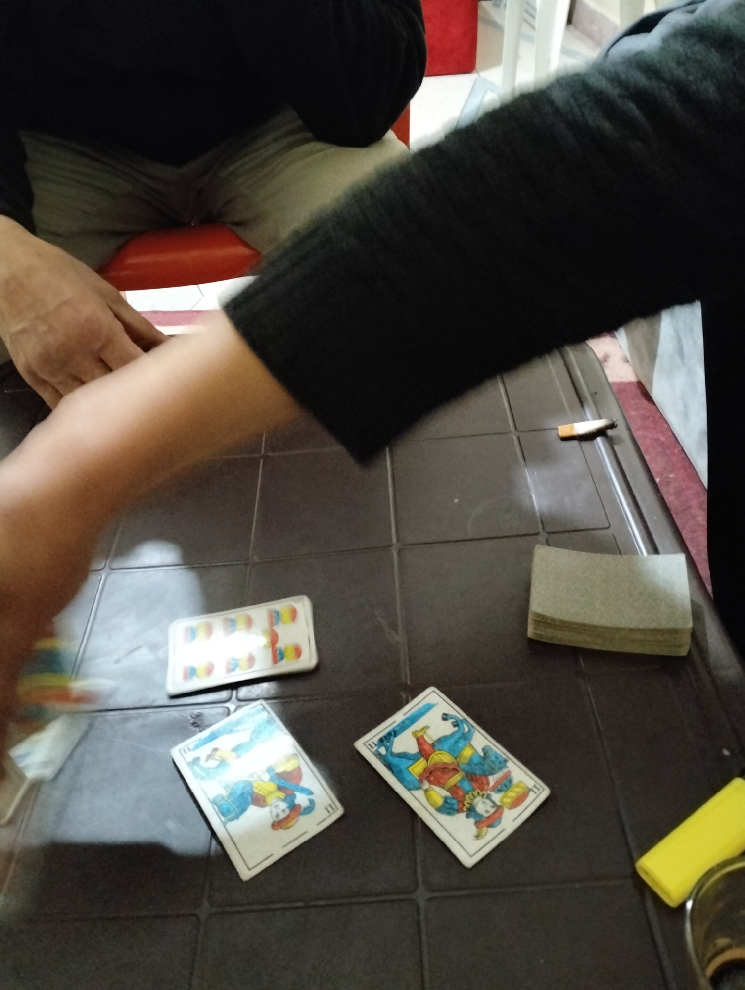 A low-angle, indoor shot shows a game of cards being played on a dark, possibly plastic or melamine table. Two people are partially visible; one is seated, wearing khaki pants and a dark long-sleeved shirt, their hand resting near the edge of the table. The other person's arm, clad in a black sweater, reaches into the frame. Visible on the table are: three playing cards face-up, a deck of cards face-down, a cigarette butt, and a yellow lighter. The playing cards are typical Italian or Spanish style playing cards, with vivid color illustrations. The table itself appears to be a type of folding or picnic table, with a molded or textured surface. There is no visual evidence indicating the image's location in Ouaouizert, Morocco, as it is an indoor shot focused on the card game.