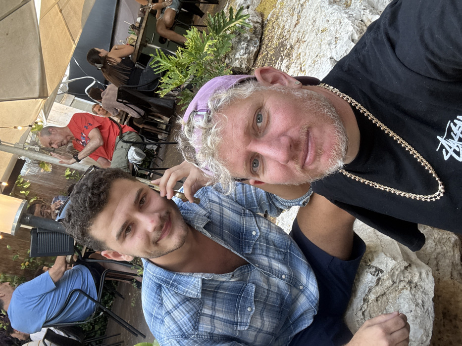 The image captures an outdoor dining scene in Tel Aviv, Israel, during daylight hours. In the immediate foreground, two males are featured. The male on the right, taking a selfie, has light blonde curly hair, blue eyes, a short beard, and wears a black t-shirt with a white graphic (Stussy logo), a thick gold chain, and a reversed light purple baseball cap. To his left, a younger male with dark curly hair and a slight mustache wears a blue plaid long-sleeve shirt and dark blue shorts, holding a gold-colored smartphone to his left ear while looking towards the camera. Both are seated on large, light-colored rocks that constitute part of the ground. In the midground and background, multiple individuals are seated at tables. An older male in a red t-shirt and olive green shorts is visible, gesturing with his right hand while seated at a dark wooden table. To his right, two females are seated at another table. Further left, partially obscured, is a male in a light blue t-shirt seated at a dark table. The dining area is characterized by green foliage, string lights, a wooden fence in the background, and a large beige canopy umbrella providing shade. The ground surface is composed of large white rocks interspersed with soil and yellowish plant debris.