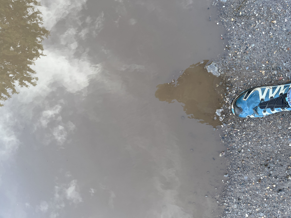 A top-down view features a muddy puddle reflecting the sky with scattered clouds and the silhouette of a tree. Adjacent to the water's edge is a rough, gravelly surface. A blue and black athletic shoe sits partially on the gravel and slightly overlaps the puddle. The overall composition is dominated by the contrasts between the reflective water, the rugged ground, and the colorful shoe.
