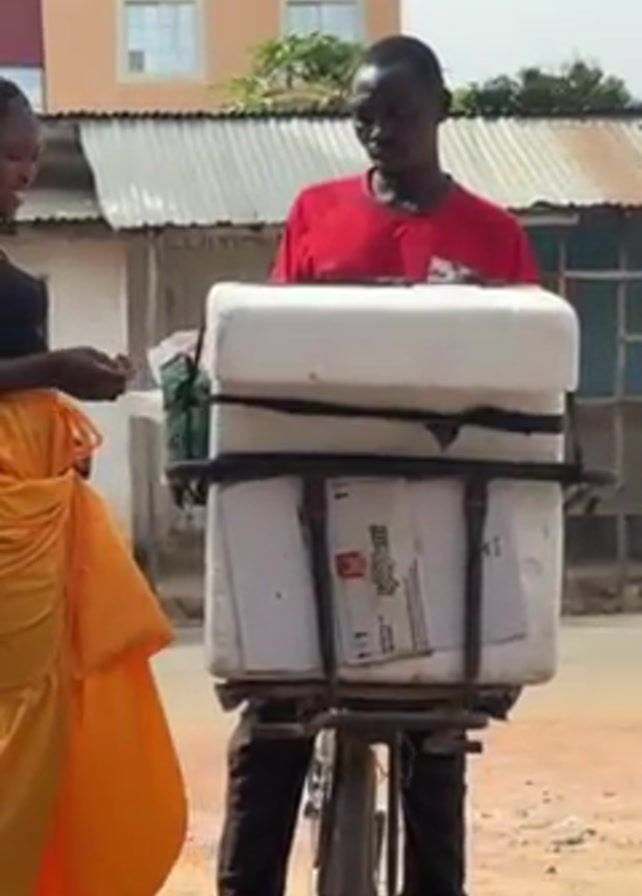 man on a bicycle loaded with two white styrofoam coolers and boxes strapped to the rack over the rear wheel. The man is wearing a red t-shirt and dark pants and sandals. A woman wearing an orange wrap-around skirt stands beside him, facing him and holding what looks like money or a receipt. The background includes buildings, one of which is labeled "SCHOOL, JOS." The street is unpaved.