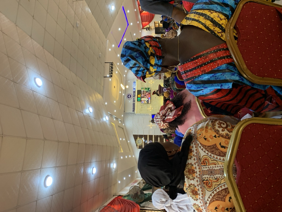 The scene depicts an indoor gathering inside "Paradise City Parish, LP 1D JH" in the city of Unknown, Unknown. The perspective is from the rear of the audience, looking towards the front of a large hall or sanctuary. In the foreground, the backs of two individuals are visible, seated on red chairs with gold-colored frames. The person on the left wears a black head covering and a long-sleeved garment patterned with orange, brown, and white designs. The person on the right wears a multi-colored headwrap featuring blue, black, yellow, and red stripes/patterns, and a matching patterned garment; a gold chain is visible on their neck, and a gold hoop earring is visible on their right ear. Beyond these two individuals, a substantial audience is seated, facing a central stage or platform at the front of the hall. Many attendees wear colorful, patterned clothing and head coverings. A large rectangular screen at the front of the hall displays the text "PARADISE CITY PARISH, LP 1D JH" along with a digital time or code "13:8". The screen also shows a live video feed of a speaker or presenter standing behind a podium on the stage. To the left of this main screen, a circular gold-colored emblem is affixed to the wall. The hall features a white, multi-paneled ceiling with numerous recessed circular lights providing bright illumination. Additional decorative lights are integrated into the wall structures. Red and green fabric drapes are visible along the left wall, and white ceiling fans are mounted in this area.