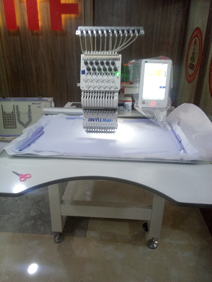 The scene depicts an indoor commercial or industrial setting in Unknown, Unknown. A JINYLI Max+ multi-head industrial embroidery machine dominates the center, positioned over a large white fabric piece stretched within an embroidery hoop on a white, curved-edge table. The machine features 15 visible needle heads and a top-mounted thread guide rack. A green indicator light on the machine suggests it is powered on. To the right of the main machine body, a white digital control panel, encased in clear plastic, displays illuminated data. On the table's left, a pair of pink scissors rests, alongside a document or template featuring two distinct neckline embroidery patterns. To the right of the fabric, folded white material is visible. The table stands on white legs equipped with casters. The floor is light-colored, possibly tiled, reflecting overhead lighting. In the background, a wooden-paneled wall on the left features large, illuminated red letters, partially spelling "TIF". On the right, another wall displays a circular emblem with a red border. No individuals are present in the image, and no active embroidery operation is occurring.