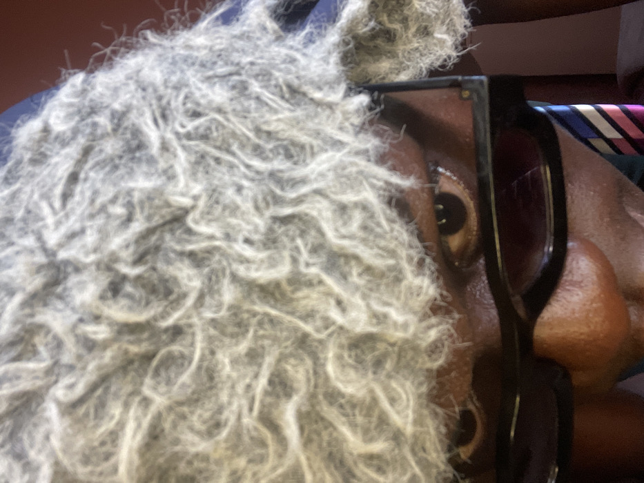 In Mosafejaw, Nigeria, a close-up, low-angle image captures an individual of dark complexion. The subject's face is partially visible, with two eyes looking directly forward, visible above a pair of dark-framed glasses with dark lenses, positioned low on the nose. The upper portion of the head is covered by a dense mass of light gray, matted, curly material, resembling a wig or textured headwear, which extends downward, obscuring the forehead and upper face. A segment of a multi-striped necktie, featuring blue, pink, and white diagonal lines, is observable below the right side of the glasses. The background is out of focus, presenting indistinct areas of dark blue and reddish-brown, indicative of an indoor setting.