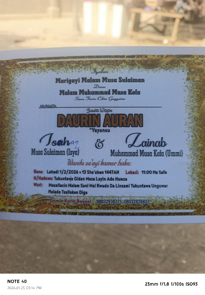 A rectangular paper document, identified as a wedding invitation ("DAURIN AURAN"), is depicted in a slightly angled, close-up shot against an out-of-focus background. The document details the marriage ceremony between Isah Musa Sulaiman and Zainab Muhammad Musa Kofa, scheduled for Sunday, February 1, 2026 (13 Sha'aban 1447 AH) at 11:00 AM. The gathering point is specified as Tukuntawa Gidan Maza Layin Ado Hamza. The main venue for the ceremony is the Malam Sani Mosque, located in Mai Kwado Da Linzami, within the Tukuntawa Unguwar Malado Tsallaken Diga area, which is situated in the city of Tudun Wazurchi, Nigeria. The document features a white background with decorative golden-brown borders and black text. Two contact phone numbers (08032938775 and 08032828837) are listed for inquiries. The background is blurred, showing light-colored ground and a faint, indistinct wooden structure in the upper right, suggesting an outdoor or brightly lit indoor setting. No individuals are visible.