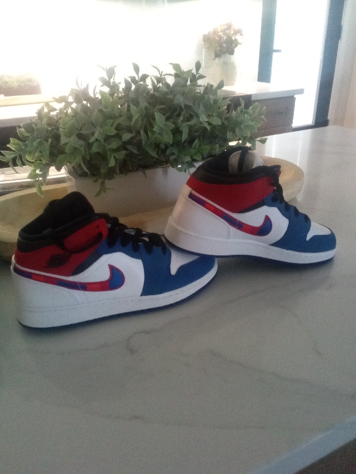 The image displays two miniature or decorative sneakers positioned on a light-colored, subtly veined countertop or table surface in an indoor setting. The sneakers, designed in the style of Air Jordan 1 Mids, are predominantly white, royal blue, and red. They feature blue toe boxes, white mid-panels, and red ankle collars, with black laces and inner lining. A white Nike 'Swoosh' logo, detailed with a red and blue stripe pattern, is visible on the lateral side of each shoe. The sneakers are arranged side-by-side, facing left, with one slightly advanced. In the background, a white rectangular planter containing a dense, bushy green artificial plant is situated behind the sneakers. Further right in the background, a light-colored vase with artificial flowers rests on a piece of furniture, partially visible. The scene is brightly illuminated by ambient light. The specific location within Los Angeles, United States of America, cannot be determined from the provided visual information.