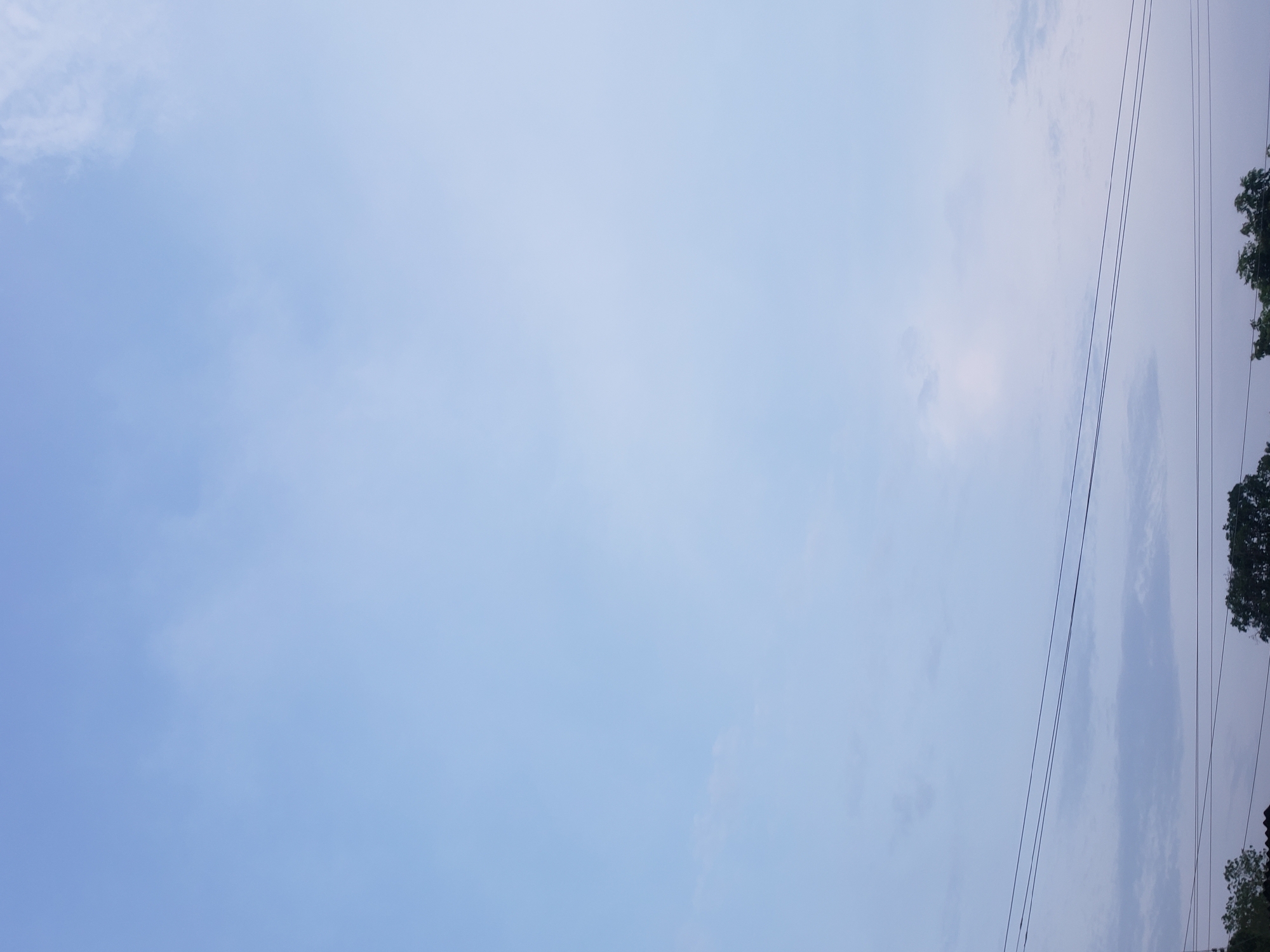 The scene is set in Adankolo, Nigeria, depicting an expanse of a pale blue sky with scattered, diffuse light clouds, occupying approximately the upper two-thirds of the frame. Horizontally across the lower third of the image, three distinct dark lines, consistent with utility wires, traverse the width of the view. Below these lines, at the very bottom edge, dark green tree foliage is partially visible, with an indistinct dark angular shape, possibly a rooftop, subtly discernible amidst the vegetation on the lower left. No individuals, specific actions, or other significant objects are present within the captured frame.