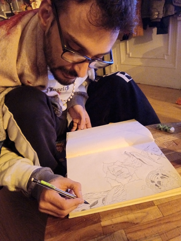 A man with glasses and a beard is sitting on the floor drawing in a large sketchbook. He wears a light-colored sweatshirt with “Los Angeles” printed on it, a string of white beads, and dark pants with a white stripe. The sketchbook contains a detailed drawing of a rose, a wolf, and a pocket watch. The wooden floorboards are visible beneath the sketchbook.