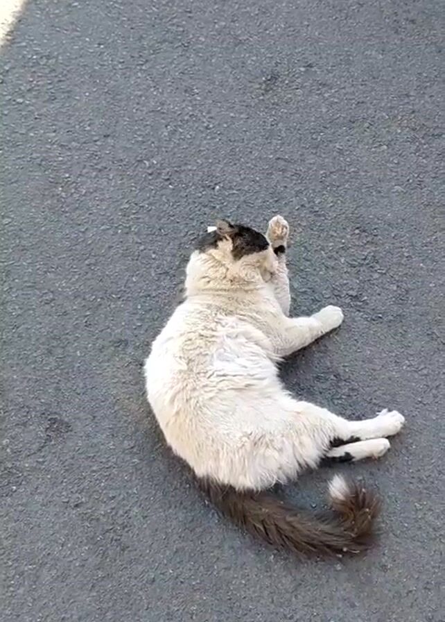 A white cat with black markings on its head and a dark tail lies on a gray asphalt surface and licks its paw. The cat is positioned centrally in the frame, and the surface is somewhat rough. There's a narrow strip of sunlight along the left side of the frame and a curb along the top right. The cat appears to be grooming itself.