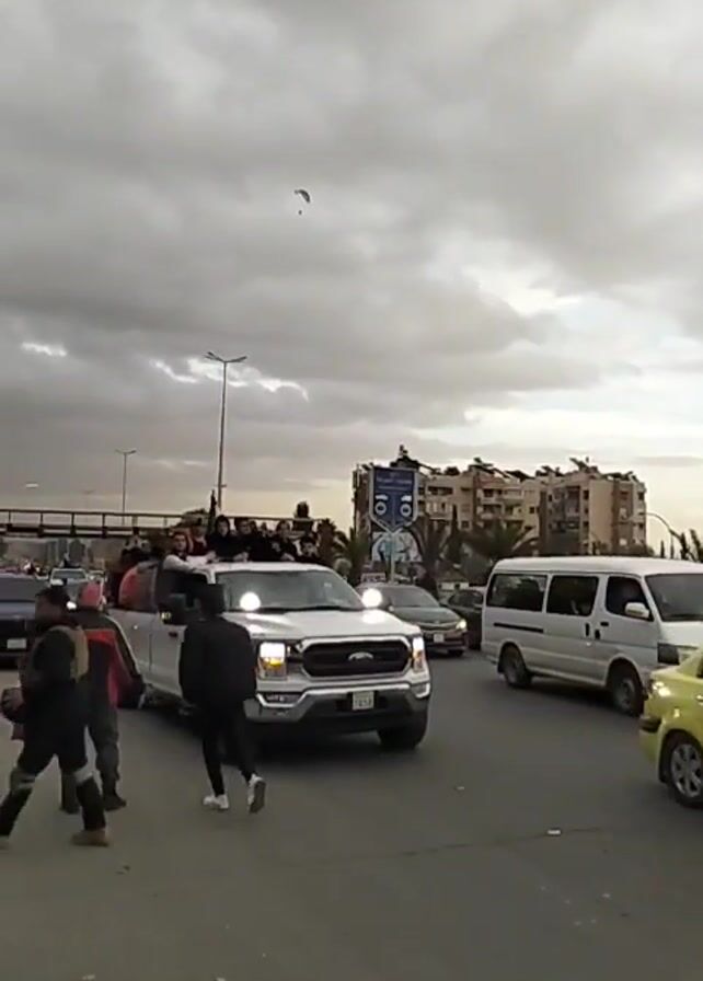 street scene in what appears to be an urban area. A white pickup truck is driving through the intersection carrying approximately a dozen people in its bed and along the cab's roof. Several individuals are standing near the vehicle. Other cars, including a police car, a white van, and a yellow taxi, are visible in the surrounding traffic. Overhead, a single paraglider is visible against a cloudy sky. Buildings, streetlights, and an overpass are also present in the background. The overall atmosphere suggests a gathering or celebration.