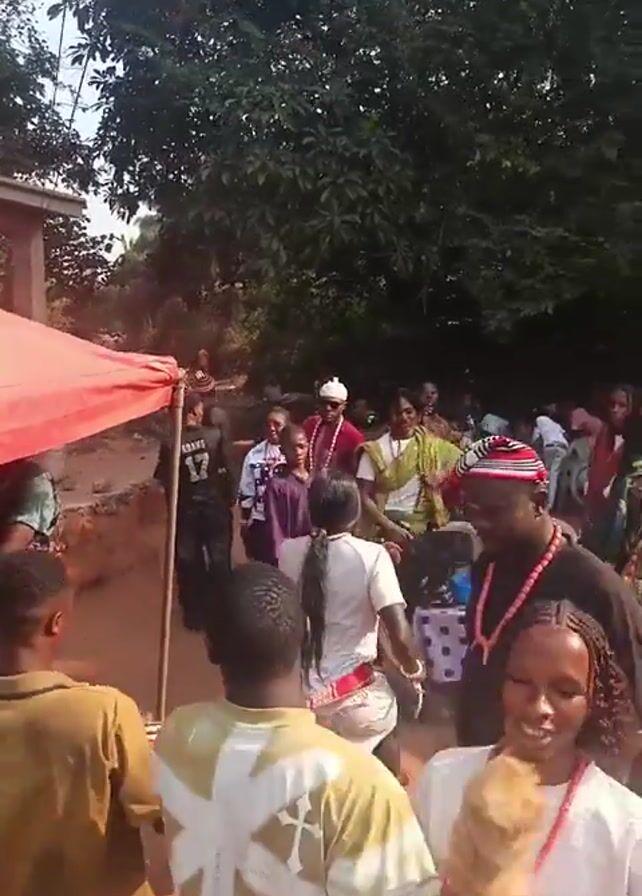 gathering of people outdoors, likely at a ceremony or celebration. Many are wearing traditional African clothing, including beaded necklaces and wrappers. A man in a red outfit and white hat is being fanned with a woven fan, as he walks through the crowd. Other individuals wear patterned shirts and dresses. A red canopy stands on the left side of the frame. The event appears to be taking place in a rural area, with trees and a dirt path in the background. There are also chairs and tables set up, suggesting a planned event.