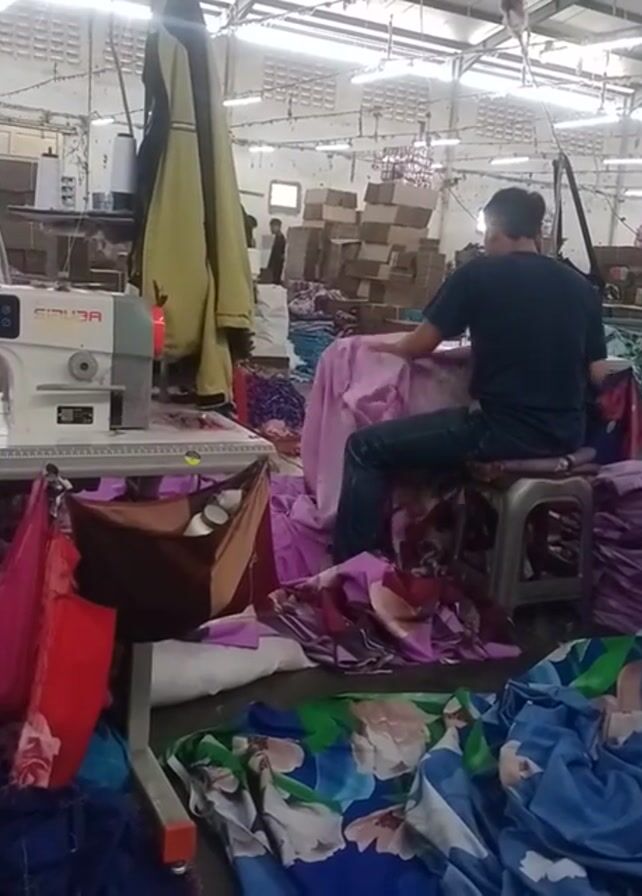A man stands on a small stool, leaning over a pile of lilac fabric. He wears a dark long-sleeved shirt and blue jeans. To the left of him is a sewing machine. Various pieces of fabric in different colors and patterns surround him. Boxes are stacked in the background of what appears to be a large manufacturing space with bright overhead lighting.