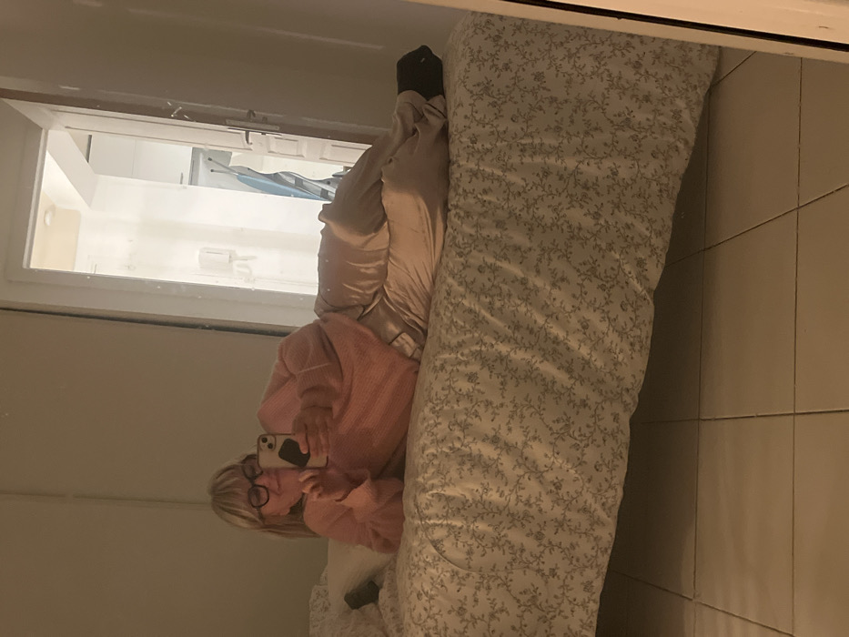 A mirror reflects a woman with blonde hair and glasses, wearing a pink sweater, taking a selfie with her phone. She's lying on a bed covered in a floral patterned duvet. Her legs are tucked beside her, clad in taupe-colored pants and dark socks. The room reflected in the mirror appears white and bright, revealing what seems like a bathroom interior. Tiles are visible on the wall adjacent to the bed.
