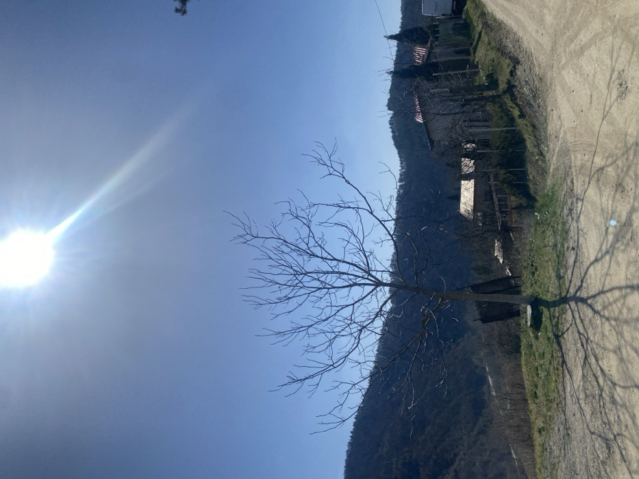 The scene is an outdoor panorama in Vlado Trichkov, Bulgaria, under direct sunlight with a clear blue sky. A solitary, deciduous tree, devoid of foliage, is centrally positioned on a grassy knoll in the mid-ground, casting a distinct shadow pattern across the dirt road foreground. The sun, emitting lens flare and light rays, is situated in the upper-left quadrant of the sky. In the background to the left, a dark, mountainous terrain with sparse vegetation is visible. To the right of the central tree, a cluster of buildings, including one with a red-tiled roof and another with a lighter-colored roof, are partially obscured by intervening bare trees and fences. A light-colored utility vehicle is partially visible on an elevated unpaved road segment in the far right background. The foreground consists of an unpaved bifurcating road surface. No human subjects or discernible activity are present.