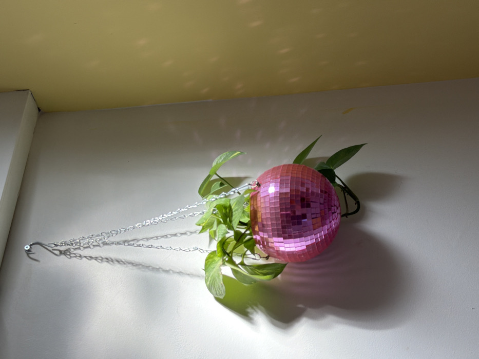 - "An indoor scene depicts a pink, spherical disco ball planter, approximately 15-20 cm in diameter, containing a green leafy plant with variegated leaves, consistent with Epipremnum aureum (Pothos)" by FM-k41Xm2, licensed under CC BY 4.0