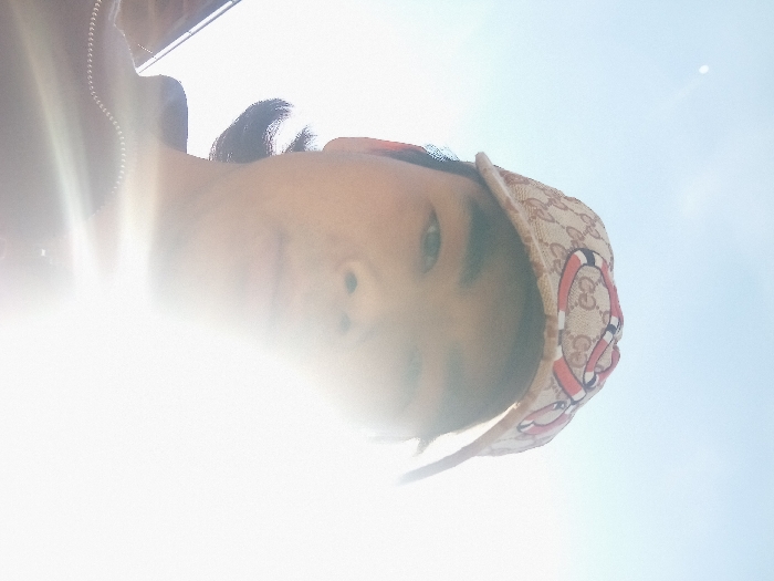 The image depicts a single individual, reportedly located in Takhtakuprik, Uzbekistan. The subject, an adult male with discernible East Asian or Southeast Asian features, is presented in an outdoor setting under intense natural light. He is wearing a beige baseball cap featuring a repeated "GG" monogram pattern and a red and black king snake design, consistent with a Gucci branded item. A dark, zippered garment is partially visible on the lower left portion of the image. A powerful light source, presumed to be the sun, is positioned behind the subject, causing significant backlighting, severe overexposure, and lens flare that obscures the right side of the subject's face. The visible background consists primarily of a light blue sky, with a faint circular object discernible in the upper left quadrant. A dark, indistinct structure with a sloped roofline is partially visible in the far left background.