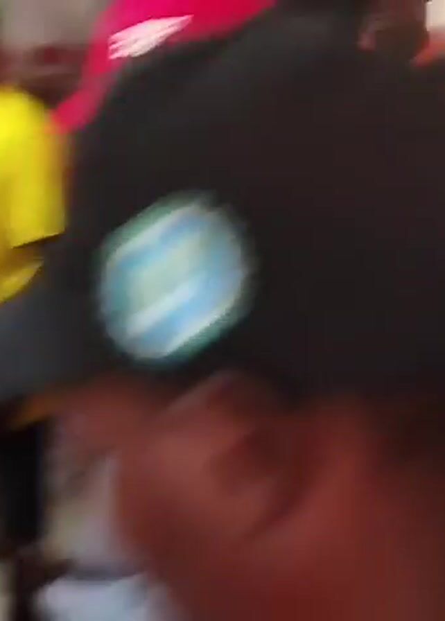 . The video shows a room filled with people, mostly men, wearing orange t-shirts and black baseball caps with a circular logo. The t-shirts also have writing on the back, including the words "NIGERIAN INSTITUTE...LEATHER AND LEATHER..." and "TECHNOLOGY" with the acronym "NLT." Some individuals are looking around, possibly listening to someone speaking, while others seem to be talking amongst themselves. Some people are holding phones. The room has white walls, windows with curtains, and a dark-colored door. There are tables in the room and what appears to be boxes.