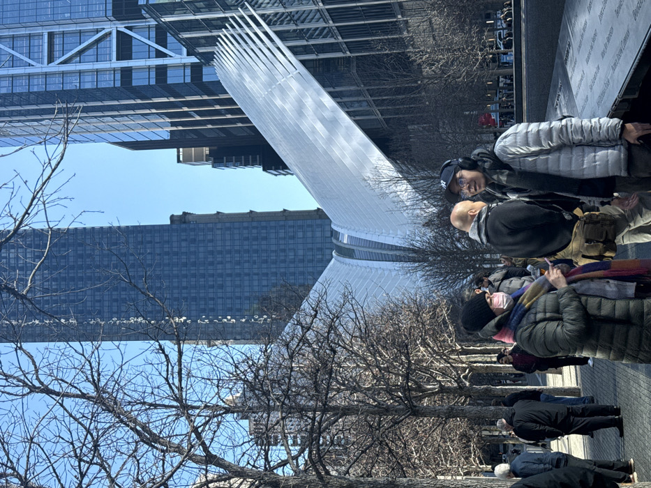 A photograph shows a group of people along a pathway. Bare trees line the walkway. A white, modern building with pointed spires dominates the background, with other buildings surrounding it. The sky is blue. The image appears to be taken in an urban setting. A memorial wall is visible on the right side of the image.
