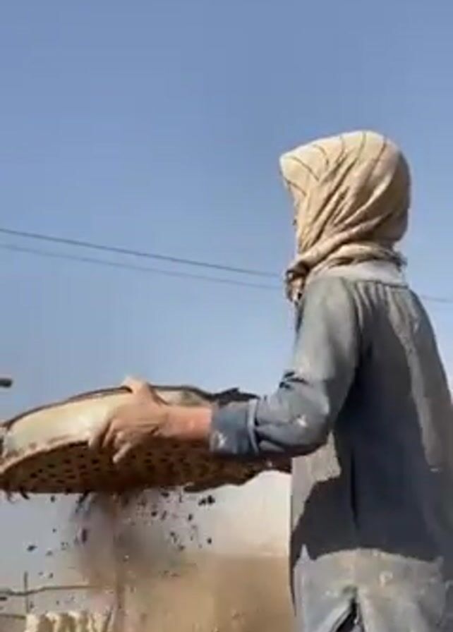 A person wearing a head covering and blue clothing shakes a sieve, dropping soil or dirt, against a bright sky.