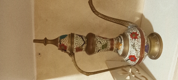 A single, ornate metal ewer stands upright on a flat, light-toned surface. The ewer, crafted from what appears to be brass or bronze, exhibits a tall, slender profile with a flared base, a bulbous lower body, a constricted waist, and a conical upper section topped with a pointed finial. A long, curved spout extends from the ewer's right side, tapering to a narrow opening. A curved handle, detailed with a branch-like texture, is affixed to the left side, connecting the body to the hinged lid. The ewer's surface is extensively decorated with white enamel, featuring intricate floral and foliate motifs rendered in multiple colors including red, green, blue, purple, and gold. Sections of the underlying metallic surface are visible between the enameled patterns. The ewer is positioned against a plain, light beige wall. To its lower left, a fragment of a white decorative panel with cutout, possibly floral or geometric, patterns is visible. The scene is devoid of people or any depicted actions or interactions. This type of decorative ewer is consistent with artisanal goods found in traditional markets in Moroccan cities, including Meknes.