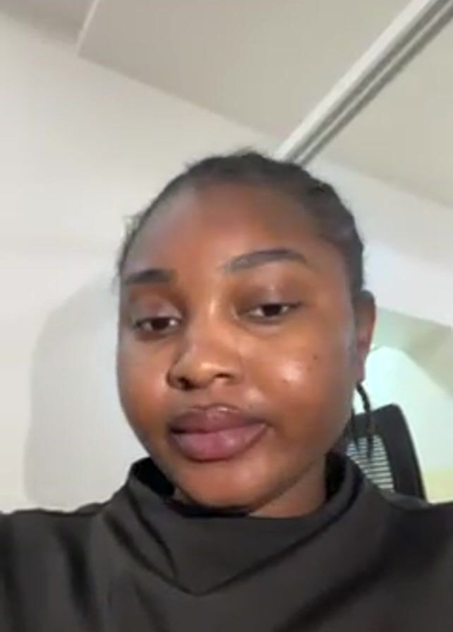 A medium shot shows a woman from the chest up, looking directly into the camera. She is in a room with a white ceiling. The woman has dark skin and her hair is braided back from her face. She is wearing a high-collared black shirt. The room appears to be an office, as an office chair is partially visible behind the woman. The lighting is bright and even.