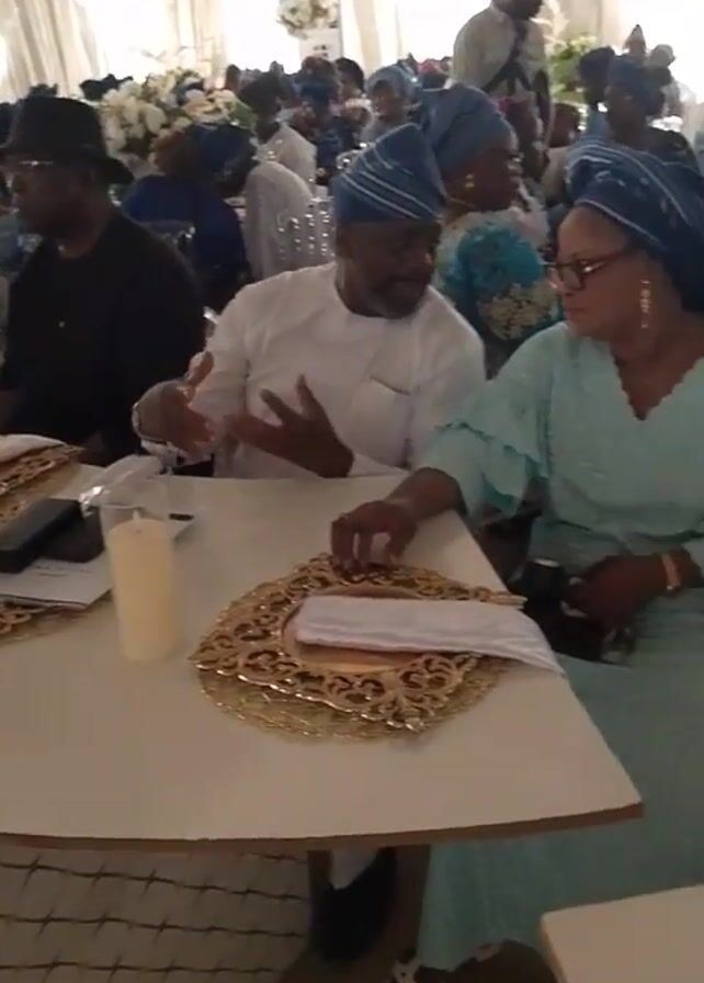 n indoor celebration, possibly a wedding reception or similar event. A long table dominates the foreground, covered with a white tablecloth and adorned with gold-colored placemats, napkins, and candles. Several people, mostly women, are seated around the table. They are dressed in traditional Nigerian attire, including colorful outfits and head wraps (gele). Some of them are engaged in conversation while others are looking at their phones. In the background, more people are seated at other tables, suggesting a large gathering. The room is decorated with white curtains and floral arrangements, contributing to a festive atmosphere.