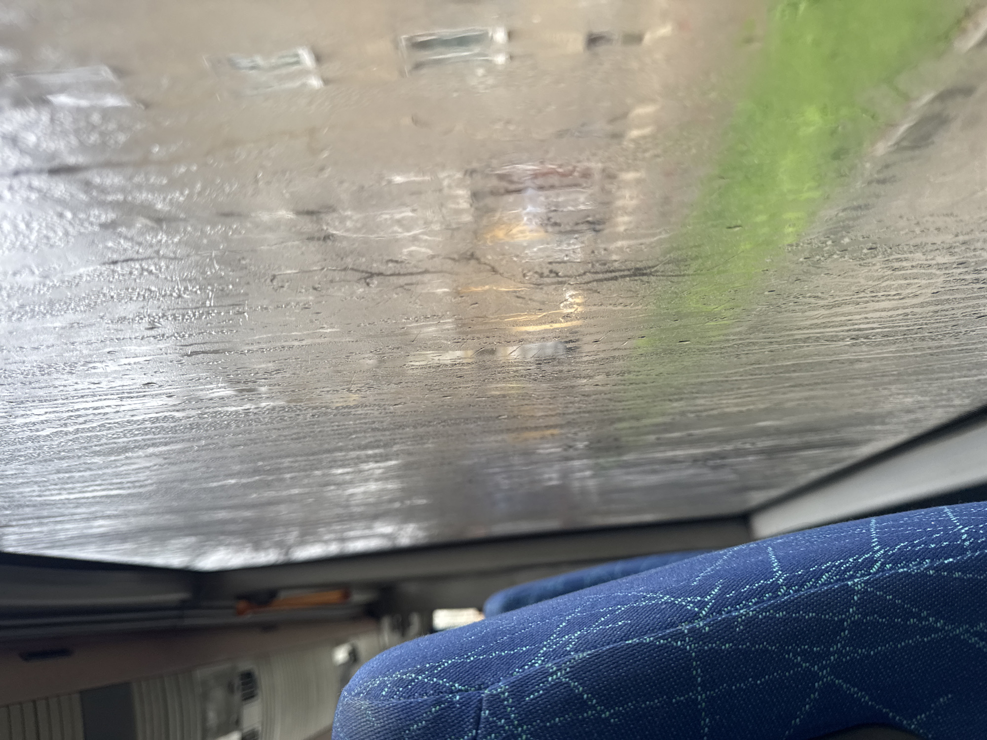 view from inside a bus or train in Veliko Tarnovo, Bulgaria, with the camera pointed upwards toward the ceiling and the window above. The ceiling appears to be a metallic surface with multiple square lighting fixtures. Outside the window, a blurred view of the surrounding environment, including greenery and buildings, is visible. The window has water droplets, indicating that it is raining or has recently rained. In the foreground, the top of a blue, patterned seat is visible. The overall impression is that the photo was taken during a bus or train journey in wet weather.