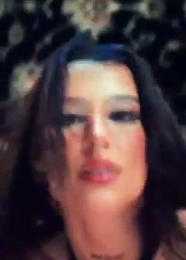 A woman dances in a studio. She is wearing a black bra-like top and black sweatpants. She has long black hair and tattoos on her arms. The lighting is dim with a pool of light on the floor. She moves her arms and body to the music.