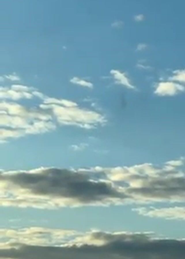 cloudy sky with light blue peeking through. There are various layers of clouds, some wispy and some thicker, and the lowest layer appears darker. A street sign is momentarily visible in the lower right corner of the screen.