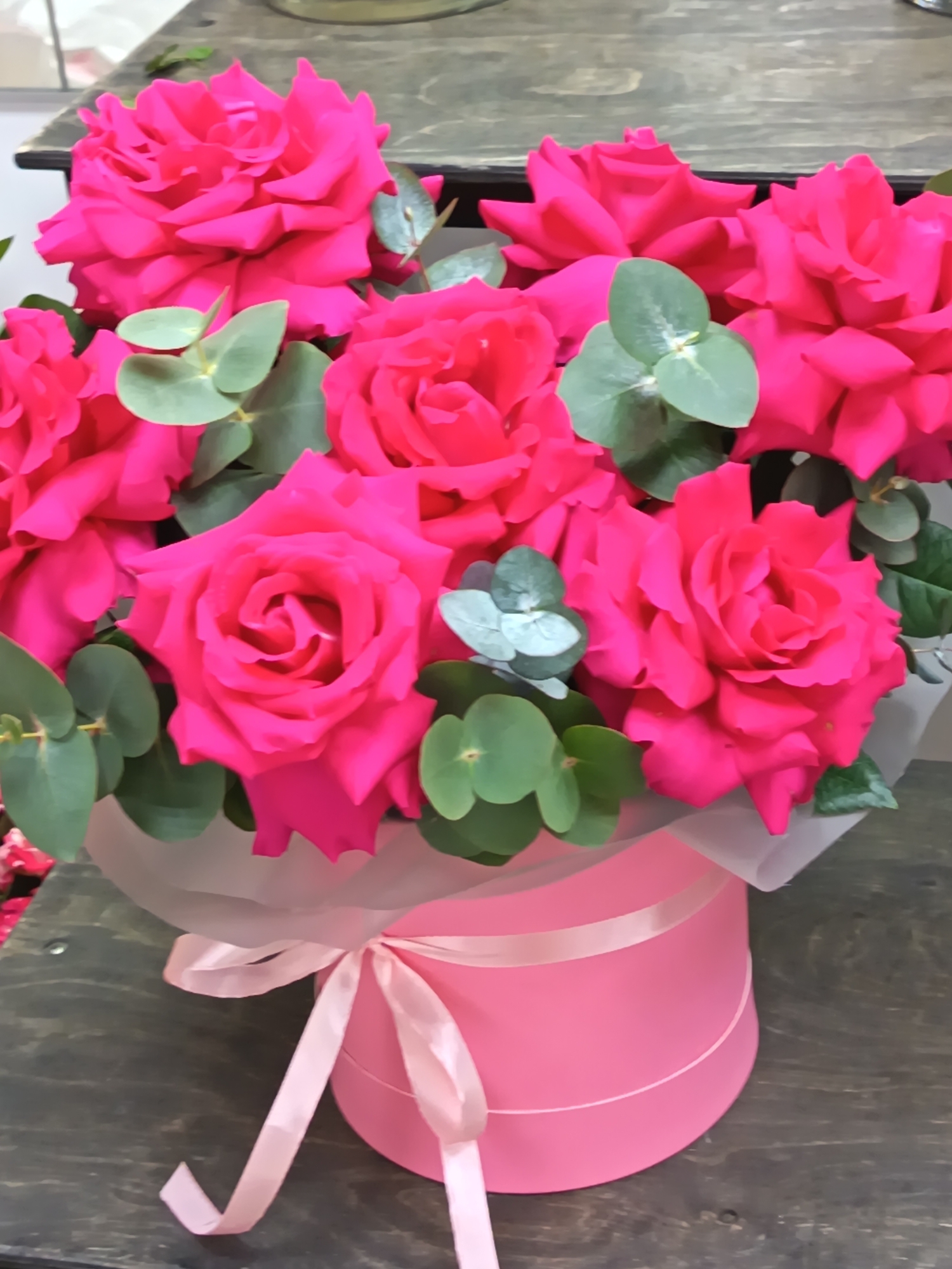 A close-up shot shows a vibrant bouquet of bright pink roses arranged in a round, pink hatbox adorned with a light pink ribbon. The bouquet features the roses interspersed with green eucalyptus leaves, offering a contrasting texture. The hatbox sits on a weathered, dark wooden surface, and a glimpse of a similar wooden surface is visible behind the bouquet. The photograph appears to be taken indoors with soft, natural light. There is no specific information from the image indicating it was taken in the city of Nizhnevartovsk, Russia.