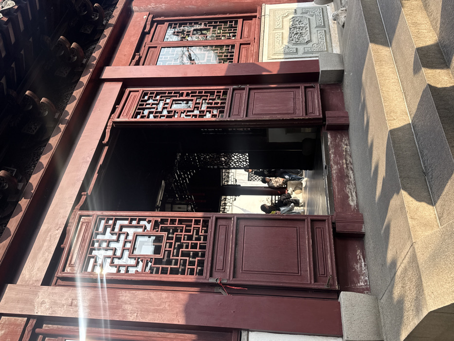 The image depicts the entrance to a traditional Chinese architectural structure, likely a pavilion or hall within a historical garden or temple complex in Shanghai, China. The building is constructed primarily from dark red (maroon) wood, featuring a prominent roof with traditional upturned eaves partially visible at the top. Two large, ornate, dark red wooden doors serve as the main entrance, standing partially open. The upper panels of these doors are composed of intricate geometric lattice patterns framing clear glass panes, reflecting bright sunlight and some architectural details. The lower panels are solid wood. To the right of the entrance, a section of the exterior wall displays a light gray stone panel adorned with detailed carved relief artwork. Three wide, shallow stone steps lead up to the threshold of the entrance. Strong sunlight from the upper left creates prominent shadows cast across these steps, indicating a low sun angle. A distinct lens flare is visible on the upper left glass panel of the left door. Through the open doors, a dimly lit interior space is revealed, featuring additional dark wooden architectural elements, including columns and patterned screens. Inside, several individuals are present. On the left, two people are seated on a light-colored surface, casually dressed. A small, light-colored pet, possibly a dog, rests on the floor near them. Further inside, other figures are partially visible, standing or moving within the shaded interior.