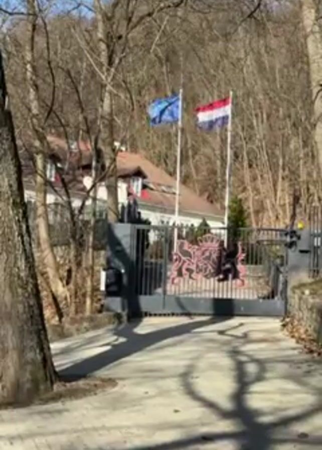 The scene shows a private residence or embassy entrance on a bright, sunny day. The camera is static, showing the view from a distance. A gray metal gate adorned with a decorative crest blocks the entrance. Two flags, one European Union and one Dutch, wave on poles behind the gate. A large, white house with a red roof is visible in the background. The property is surrounded by trees, which are mostly bare, suggesting it is late autumn or winter. The driveway leading up to the gate is paved with gray bricks. Shadows of the trees are cast across the driveway.
