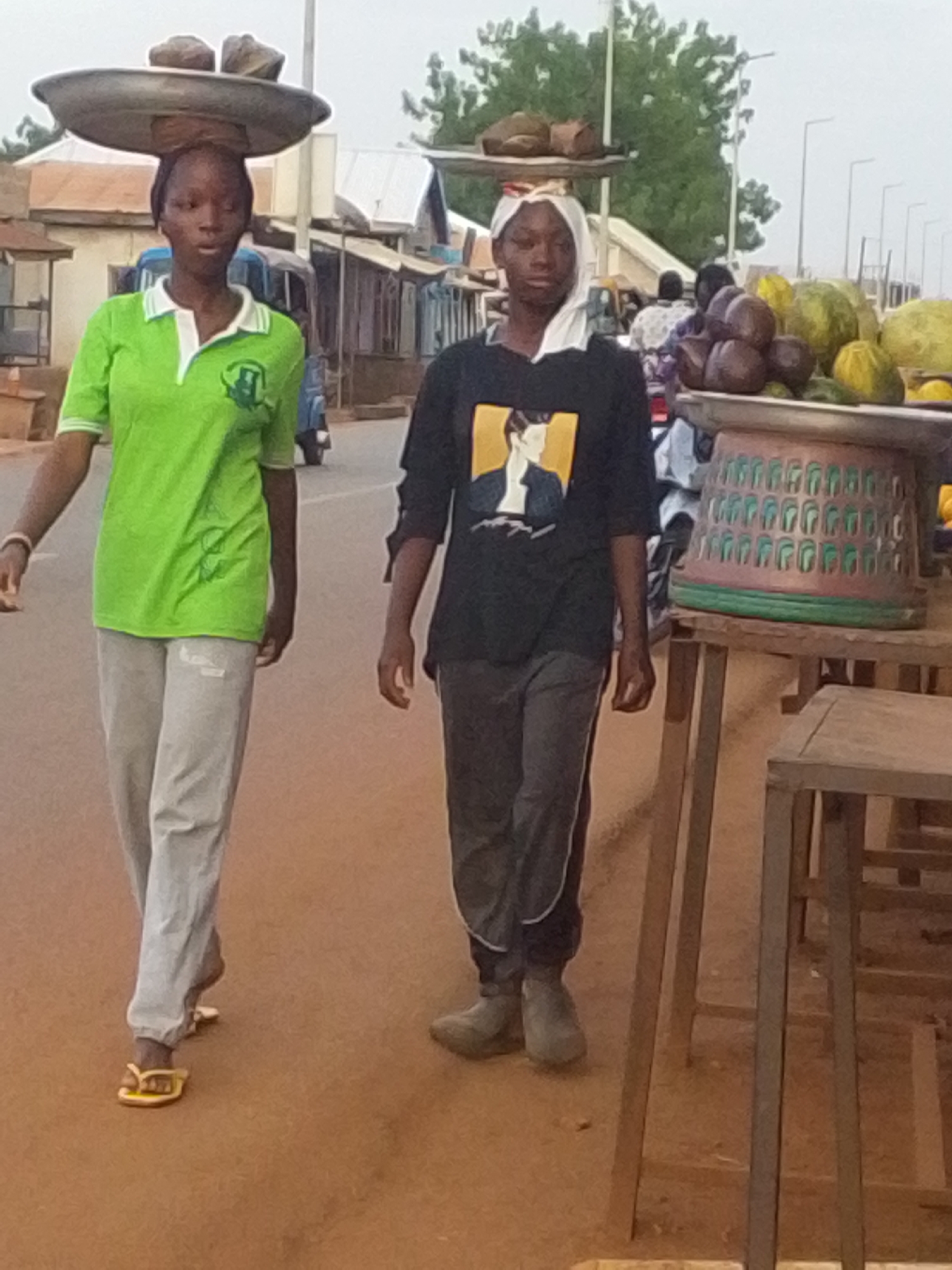 Two young people walk along a street in Tamale, Ghana. One carries a metal tray loaded with items on their head. The other has a white cloth on their head. An open-air market lines the street with displays of produce. One display contains various fruits and vegetables.