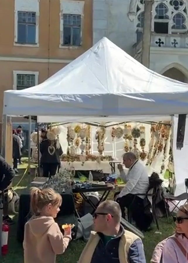 n outdoor market or festival scene in front of a large building with many windows. A white tent is set up, displaying crafted items, which appear to be decorative hangings made of woven materials, lace, and artificial flowers. A man is seated inside the tent, presumably the vendor. Several people are standing around the tent, looking at the merchandise. Some are interacting with each other, while others seem to be browsing. In the background, there's a crowd of people and a van parked. The atmosphere suggests a pleasant, sunny day at a public event.