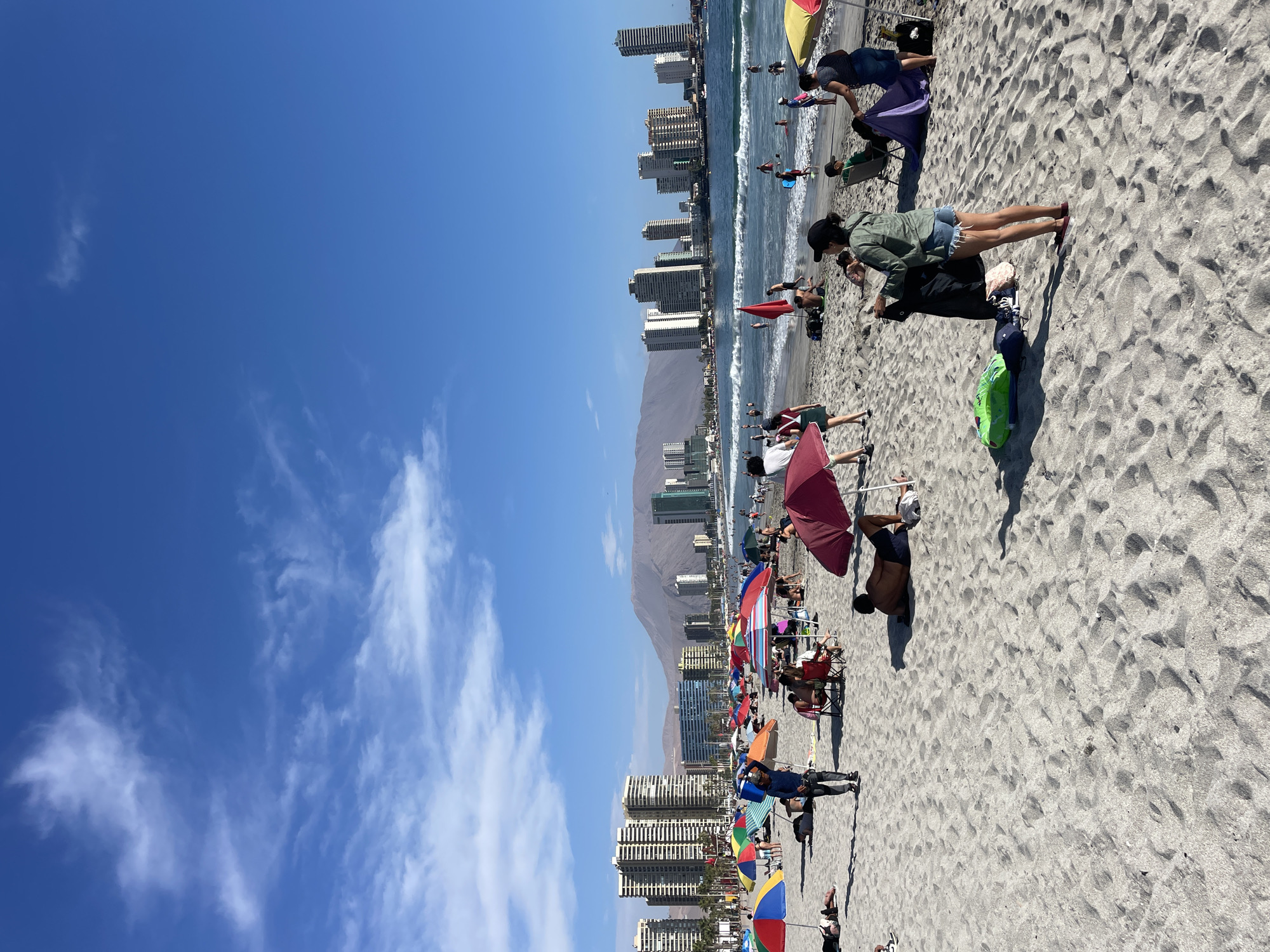 crowded beach in Iquique, Chile, on a sunny day. The beach is sandy and stretches along the coastline, with the ocean visible in the background. Tall buildings and a mountain range are prominent features of the city skyline. Numerous people are present on the beach, some swimming in the water, while others are sunbathing or relaxing under colorful umbrellas. Some beachgoers are standing or walking along the shore. The sky is clear and blue with some scattered clouds.