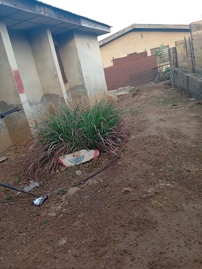 An outdoor scene includes a building with a partially visible window, adjacent to another building with a brown fence. A patch of green grass mixed with brown foliage sits in the foreground, with a discarded snack wrapper nearby. The ground appears to be dirt, and a metal pipe is visible. A partially constructed concrete wall is visible in the background. The sky is overcast, suggesting either early morning or late evening.