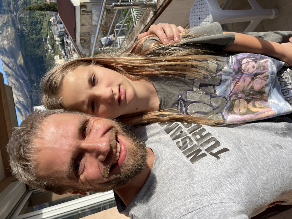 A selfie captures a man with a short, gray beard, smiling broadly, and a blonde girl with her head resting on his shoulder. The man wears a gray t-shirt with black text, partially obscured, reading "Nisan Turist." The girl's t-shirt is gray with a graphic design. Behind them is a mountain view with buildings. A white plastic chair is partially visible in the background. The photo is taken outdoors with bright, sunny lighting.