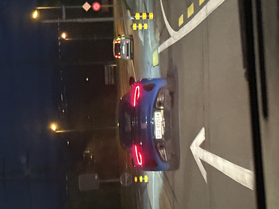The image captures a nighttime street scene in Volketswil, Switzerland