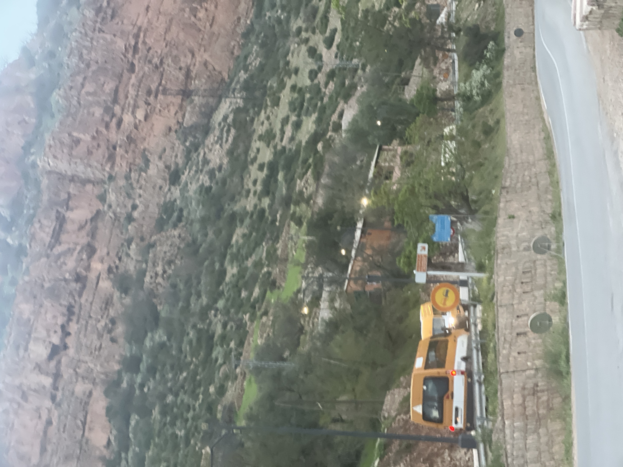 construction or maintenance vehicle parked on a roadside in Bin El Ouidane, Morocco. The vehicle is predominantly yellow and white, with a warning sign (likely depicting road work or closure) attached to it. The road is paved and bordered by a stone wall or embankment on one side. The surrounding environment includes a steep, rocky hillside covered with sparse vegetation. The overall scene suggests road work or infrastructure maintenance is underway in a mountainous area.