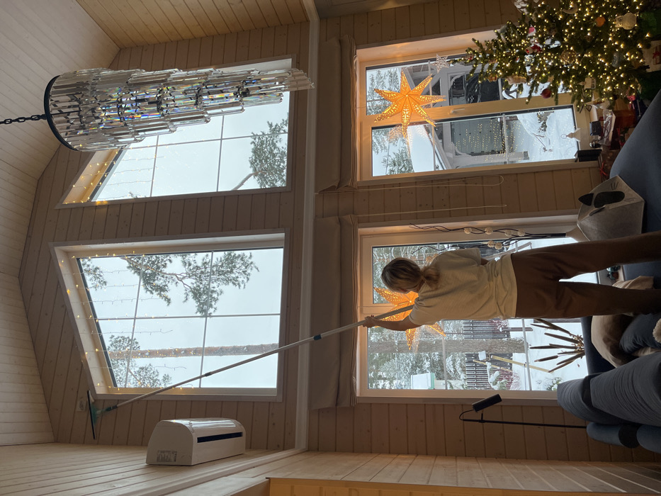 Inside a residence in Finskiy Briz, Russia, a blonde-haired individual, seen from behind, is actively cleaning a tall interior window. The person, wearing a light-colored short-sleeved top and dark trousers, stands on a dark blue sofa and extends a long, telescopic pole with a green cleaning head towards the upper portion of a large, multi-pane window. The room features light wood-paneled walls and a high, sloped ceiling. An air conditioning unit is mounted on the left wall. To the right, a multi-tiered crystal chandelier hangs prominently. Below the large upper windows, two lower windows are adorned with large, illuminated star-shaped decorations. A fully decorated Christmas tree, illuminated with lights, stands to the right. The exterior view through the windows reveals a snow-covered landscape with pine trees and what appears to be another snow-dusted structure or gazebo, along with outdoor string lights. A black floor lamp and a grey cat-shaped pet bed are visible in the foreground.
