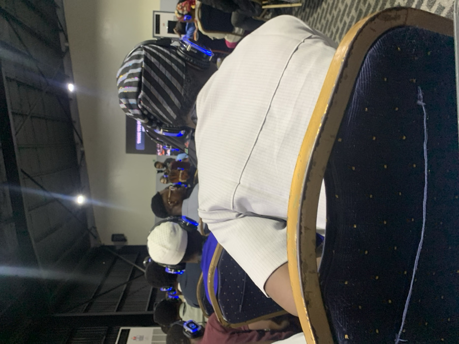 The scene depicts an indoor event hall in Alaguntan, Nigeria. Multiple individuals are seated in rows, facing away from the camera, indicating an audience. In the immediate foreground, the back of a person is visible, wearing a light-colored striped shirt, a striped Yoruba traditional cap, and blue illuminated over-ear headphones. This individual is seated in a dark blue upholstered chair with a gold-colored frame. In the midground, other attendees are visible, also wearing similar over-ear headphones, many with blue LED lights. These include an individual wearing a white skull cap over a purple shirt, and another person with dark hair, glasses, and a grey shirt, facing slightly left. Further back, several figures are standing near a large screen displaying partially visible text, including "THANK YOU P". The environment features a dark, industrial-style ceiling with visible beams and recessed lights. The walls are light-colored in the distance, and an air conditioning unit is present on the far left wall. The overall lighting is dim, emphasizing the illuminated headphones and the screen. Attendees are in a state of observation, likely listening to a presentation or performance via their headphones.