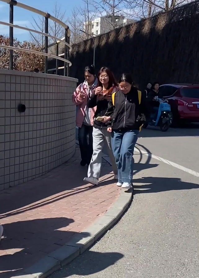 group of people walking down a sidewalk next to a road. Some people are riding light blue electric scooters in the same direction as the walking group. The road and sidewalk are paved, and there's a short brick wall separating them. On the left is a wall with a metal railing. On the right, there is a tall retaining wall and some trees without leaves. The sky is bright blue with a few clouds. The people appear to be young adults or college students. The overall impression is a sunny day on a college campus.