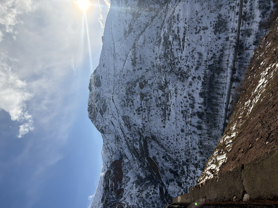 The scene depicts a snow-covered mountainous landscape in Areni, Armenia, under a bright blue sky with scattered white clouds. The sun, visible in the upper right, emits strong rays and a prominent lens flare. A large mountain, extensively covered in white snow with visible dark rock outcroppings and sparse, dark deciduous vegetation, dominates the mid-ground and background. In the lower mid-ground, a dark asphalt road traverses horizontally through a valley. The foreground on the left side features a dark brown, textured concrete or stone barrier, bordering a steep downward slope of reddish-brown earth mixed with snow patches. No individuals, vehicles, or animals are present.