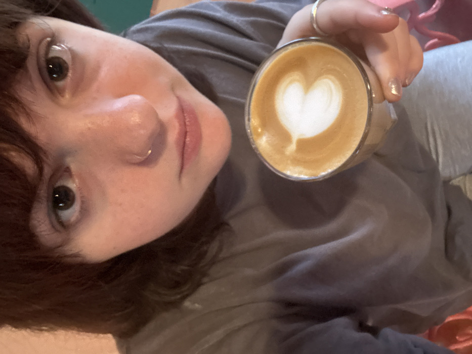A female individual is depicted in a close-up, frontal shot, holding a glass of coffee