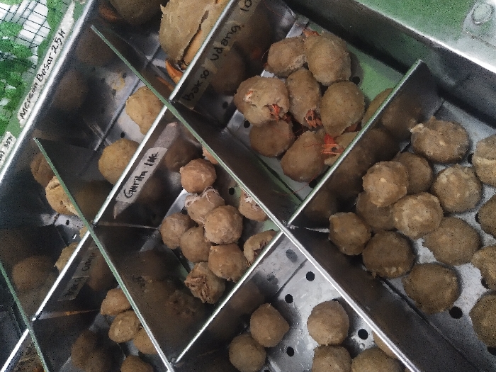 The image displays an overhead view of a stainless steel food display, located within a street food stall or restaurant in Cianjur, Indonesia