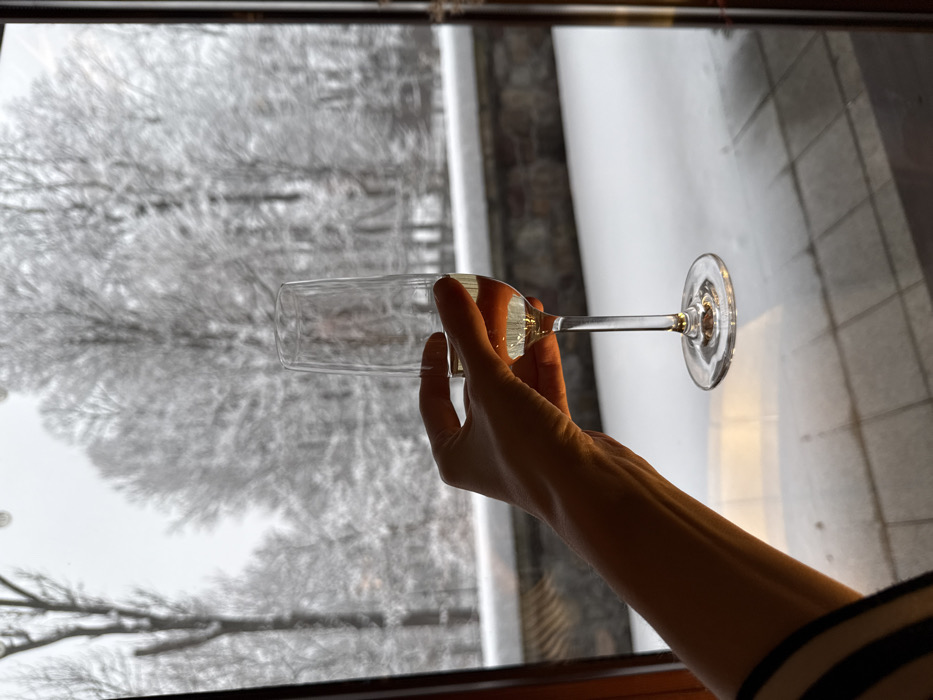 A champagne flute is held by a hand in front of a window. The wintry, snow-covered landscape is visible through the glass. Part of the arm and some striped clothing are also in the shot. Sunlight streams in from the right, illuminating the glass and part of the arm.